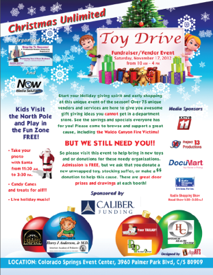 Start your Holiday giving spirit and early shopping at this unique event of the season! Over 75 vendors and services are here to give you awesome gift giving ideas you cannot get in a department store. See the savings and specials everyone has for you! Please come to browse and support a great cause, including The Waldo Canyon Fire Victims!